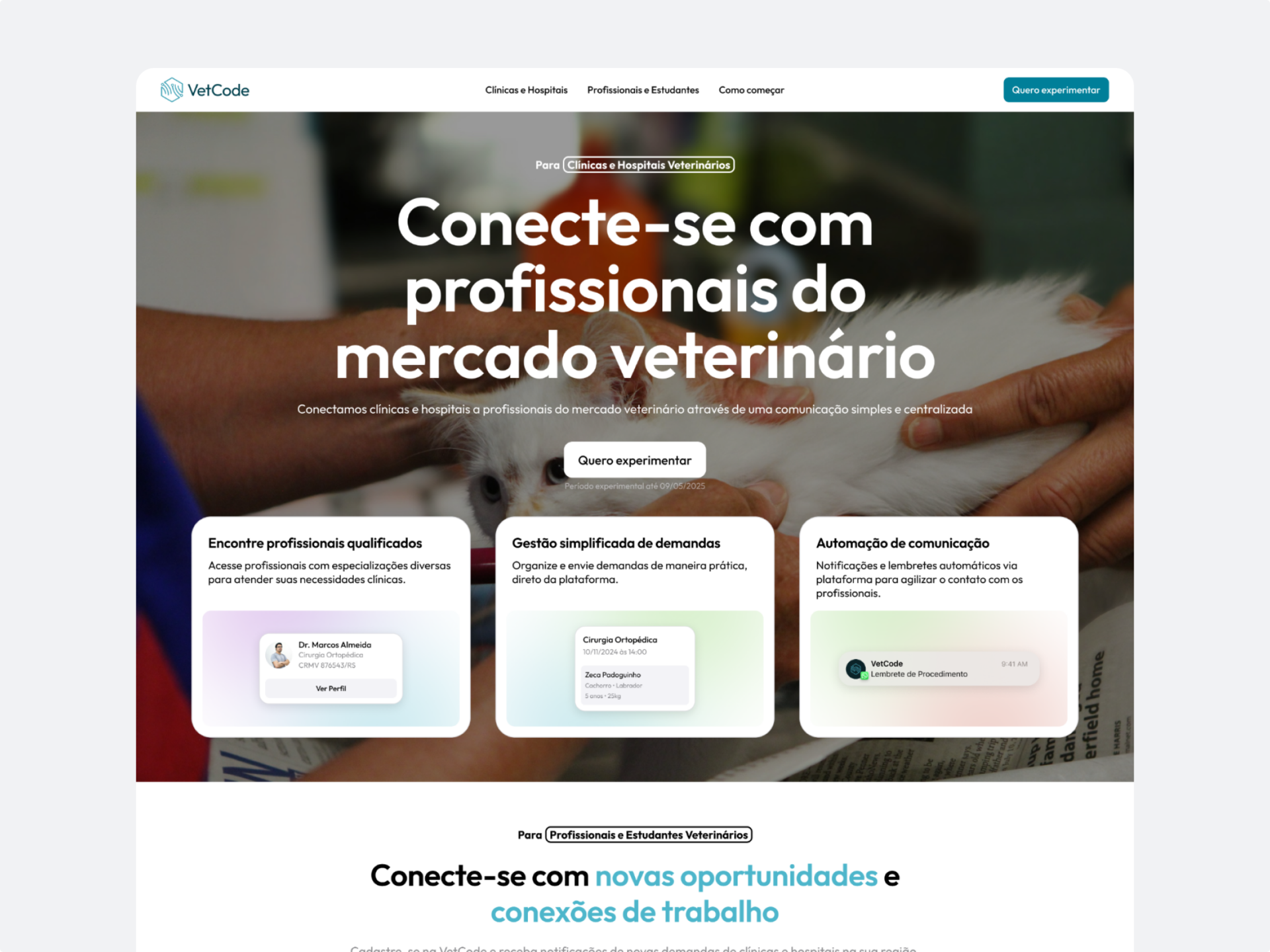Nós desenvolvemos a plataforma VetCode com foco em escalabilidade e usabilidade: