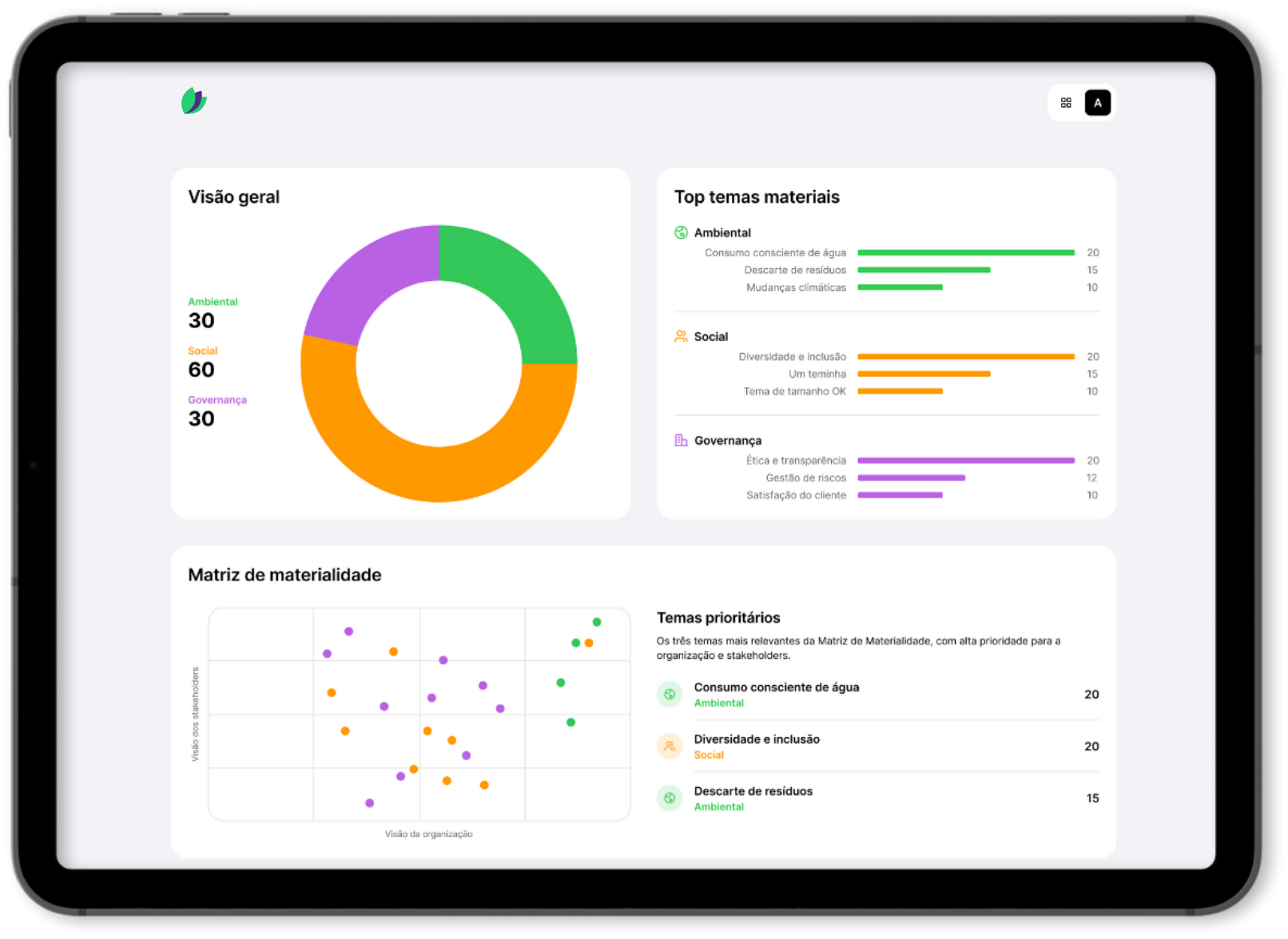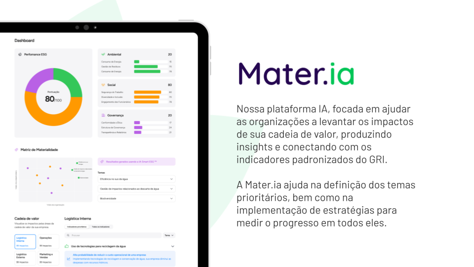 Transforme seus dados ESG em diagnósticos claros que vão guiar sua tomada de decisão. Mapeie impactos e gere sua Matriz de Materialidade com o apoio de uma IA personalizada por setor e treinada nos padrões do GRI.